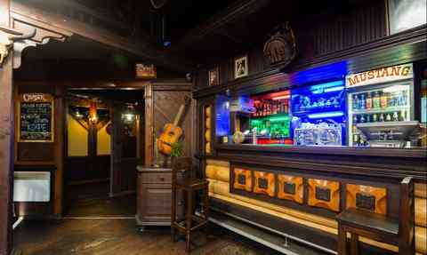Интерьер кафе-бара «Мустанг» оформлен в американском стиле. В отделке использовано много дерева, сочетание бежево-коричневой цветовой гаммы и деталей в духе Дикого Запада, что создает здесь атмосферу настоящего вестерна. В кафе есть три зала: основной с барной стойкой, VIP и банкетный. Летняя терраса представлена 6 отдельно стоящими беседками. А каждую пятницу и субботу в «Мустанге» проходят вечера живой музыки.