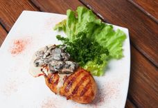 200 г • вырезка свиная, шампиньоны, лук, сыр, майонез