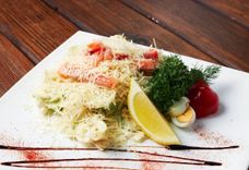 250/5 г • листья салата, черри, яйцо перепелиное, семга сл/сол, соус Цезарь, маслины, сыр пармезан, сухарики