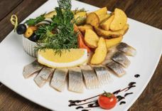 200/20/5 г • филе сельди, картофель по-деревенски, лук маринованный, зелень